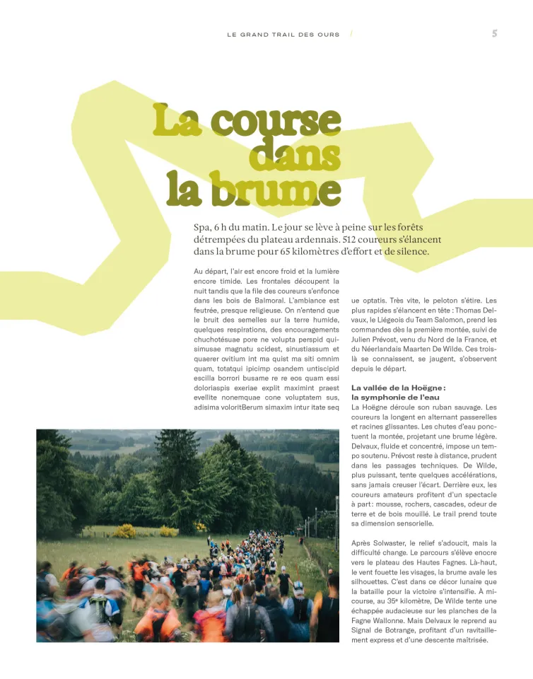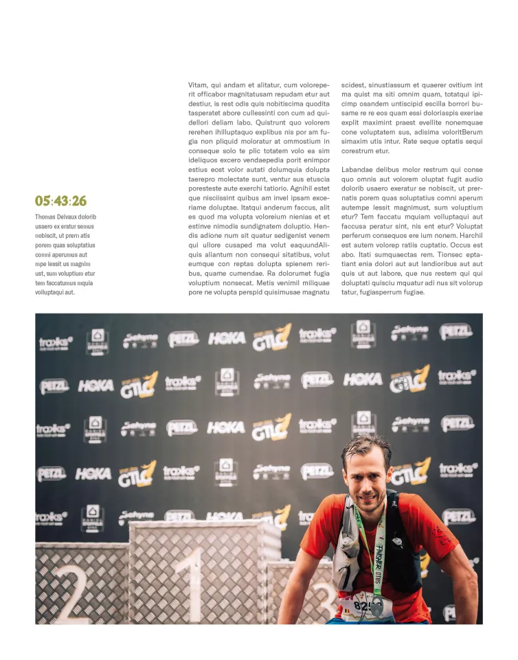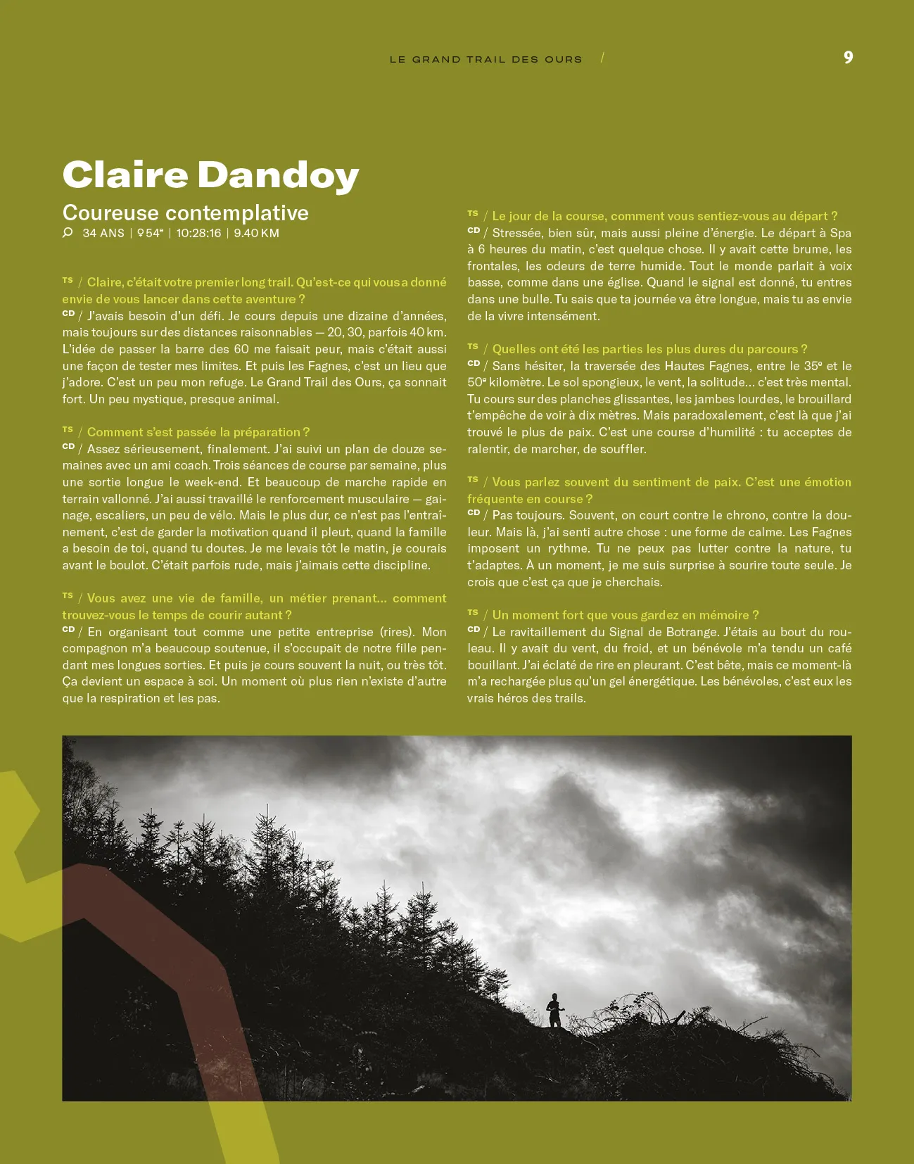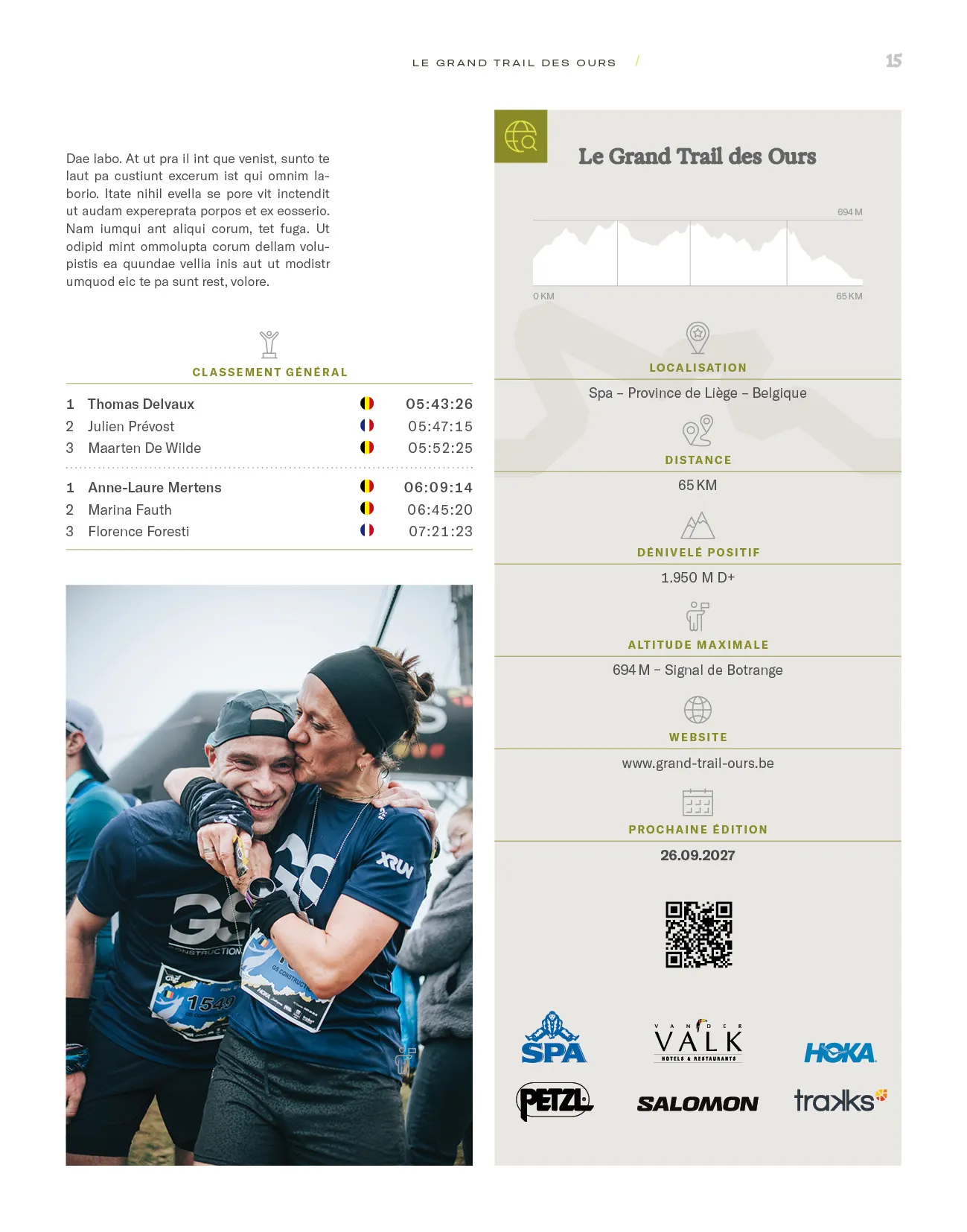 Votre trail bénéficie d’un chapitre exclusif de 12 pages, mêlant récits, photos, témoignages inspirants, résultats de la course, ... Un regard d'auteur conçu et partagé ensemble.